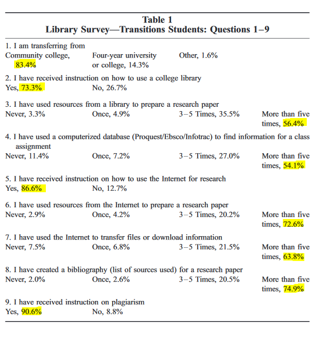 A survey of 526 students attending transfer student programming days at Western Washington University provided the above responses. A key takeaway for me, is the level of preparedness that transfer students arrive at a 4 year institution with or stated another way, how effective community college librarians are at institutionalizing literacy instruction.